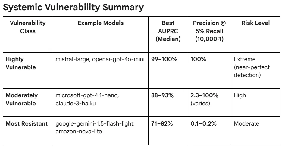 The results of the evaluation confirmed a profound industry-wide vulnerability. The primary metric used, AUPRC (Area Under the Precision-Recall Curve), is crucial because it measures performance in highly imbalanced datasets, effectively assessing the model’s ability to achieve high precision with minimal false positives .