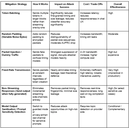 The systemic nature of Whisper Leak means it cannot be fixed with a simple cryptographic patch. Providers must fundamentally change the data transmission pipeline, often introducing trade-offs between security, latency, and resource overhead. The research evaluated three mitigation strategies to quantify their effectiveness: