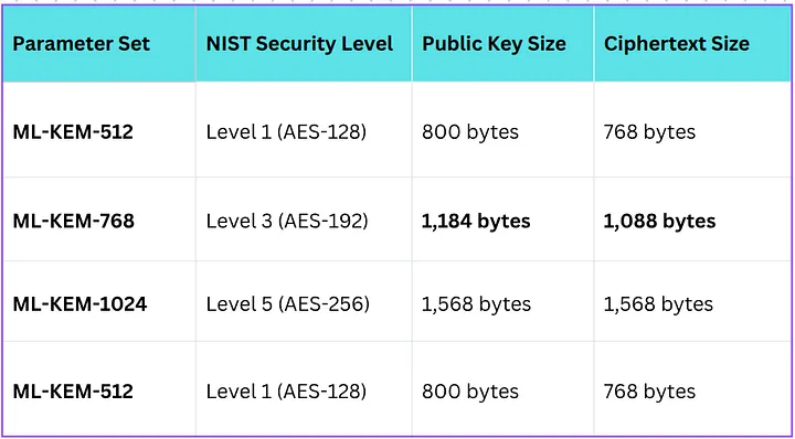 ML-KEM is defined in three parameter sets, corresponding to different security levels (AES-128, AES-192, and AES-256 equivalent).