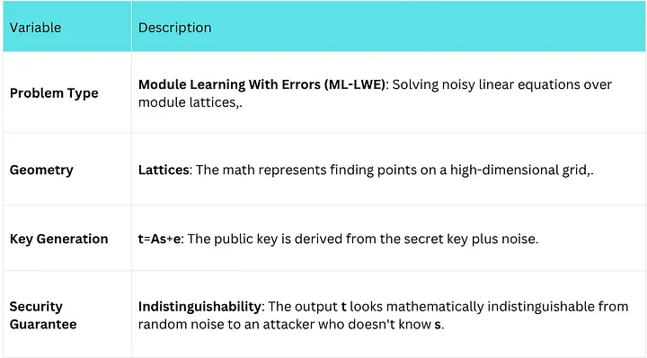 Why this formula matters: In standard algebra, if you knew A and t, you could easily solve for s using Gaussian elimination. However, because the small error term e is added, the equation becomes “noisy.” Solving for s becomes computationally infeasible for both classical and quantum computers because the noise masks the exact location of the solution on the lattice grid .
