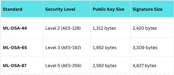 NIST has standardized three security levels for ML-DSA, corresponding to AES strengths:
